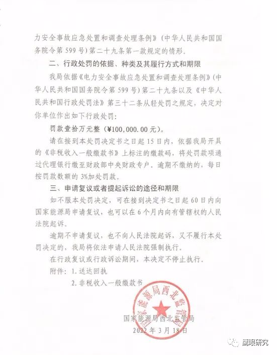 3月18日,國家能源局西北監(jiān)管局發(fā)布對陜西靖邊明陽新能源發(fā)電有限公司的行政處罰決定書(西北監(jiān)能罰決字〔2022〕5號),該公司因?qū)θ毕菰O(shè)備檢查不嚴(yán)格造成風(fēng)機墜落一般生產(chǎn)安全事故,且漏報事故信息,對其作出罰款10萬元的決定。