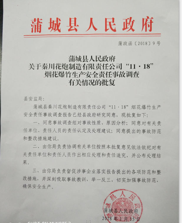 蒲城縣秦川花炮制造有限責任公司“11?18”煙花爆竹一般生產(chǎn)安全責任事故調(diào)查報告