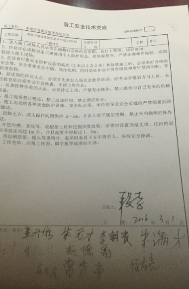 2016年3月5日,深圳城市軌道交通9號線BT項目9103-1標上梅林站1號風亭南側基坑2名作業(yè)人員(屈龍虎、屈應亮)對距離地面約1.6米左右的地連墻進行植筋鉆孔作業(yè)。