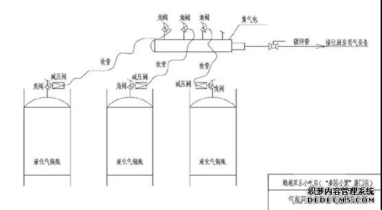 氣瓶間南北向?qū)?.5米,東西向長6米。沿北墻由西向東依次放置冰箱一臺、50Kg空瓶5只(編號為1#、2#、3#、4#、8#);沿南墻由西向東依次設(shè)置油水分離器一套、冰箱一臺、50Kg液化石油氣鋼瓶3只(編號由南向北依次9#、6#、7#)。9#、6#、7#鋼瓶中的液化石油氣通過調(diào)壓閥、燃?xì)庀鹉z軟管連接至集氣包,由集氣包向二樓廚房間送氣。