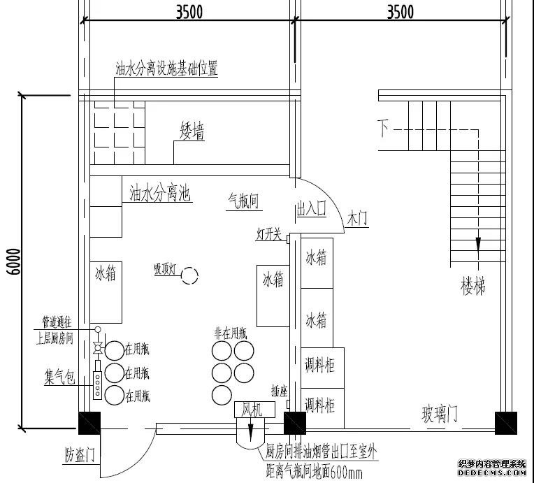廚房間設(shè)置在氣瓶間樓上(東側(cè)建筑的二樓),南側(cè)由西往東依次擺放:雙眼炒灶、不銹鋼雙層工作臺、蒸煮爐、單頭矮仔爐、湯爐、頂上吊不銹鋼煙罩;東側(cè)由南向北依次擺放:蒸包子爐、不銹鋼水槽等。廚房間內(nèi)燃?xì)忮冧\鋼管從一樓氣瓶間西南角立管延伸至二樓廚房間,沿踢腳線敷設(shè)鍍鋅鋼管,管上裝有6個”三通”,通過“三通”和支管閥門連接燃?xì)庀鹉z軟管直供雙眼炒灶1臺,其他燃器具依次由DN25鍍鋅鋼管(輸氣總管)經(jīng)“三通”及角閥與家用調(diào)壓器連接二次減壓后,分別通到蒸煮爐2臺、單頭矮仔爐2臺、湯爐1臺、蒸包子爐1臺使用。